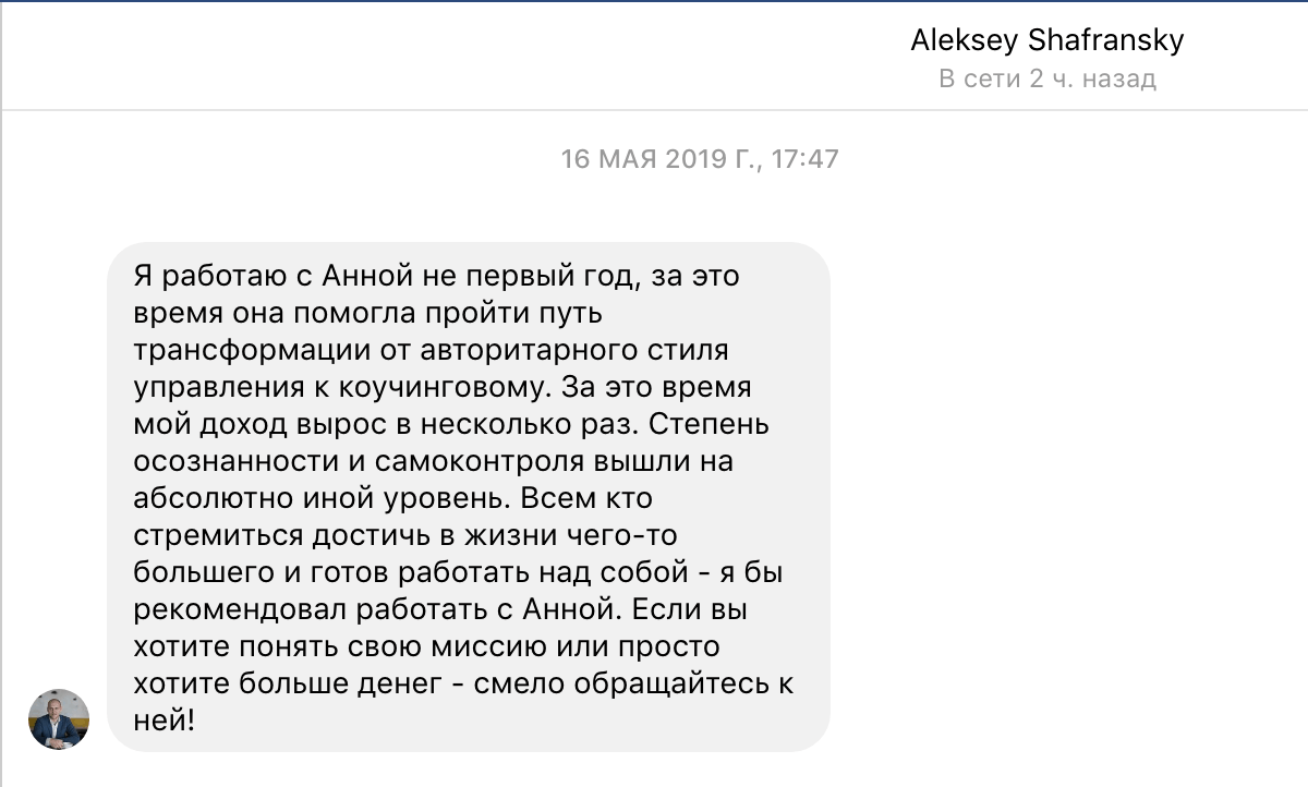 Инга – за 8 сессий значительно повысила уверенность в себе и самооценку, начала брать плату за свои услуги (до этого работала бесплатно), создала свой продающий сайт и получила приглашение провести тренинг в другой стране за хороший гонорар